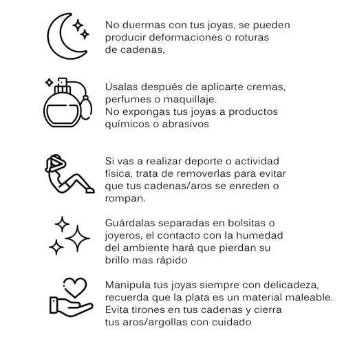 • Evita el contacto con perfumes, cremas, maquillaje y productos químicos - aplícalos antes de ponerte las joyas • Quítate las piezas antes de nadar, bañarte, hacer ejercicio o dormir • Guarda cada pieza por separado en un lugar seco para evitar rayones • Limpia suavemente con un paño suave y seco después de cada uso • No uses productos químicos de limpieza - solo el paño incluido • Evita el contacto con agua, sudor y humedad excesiva